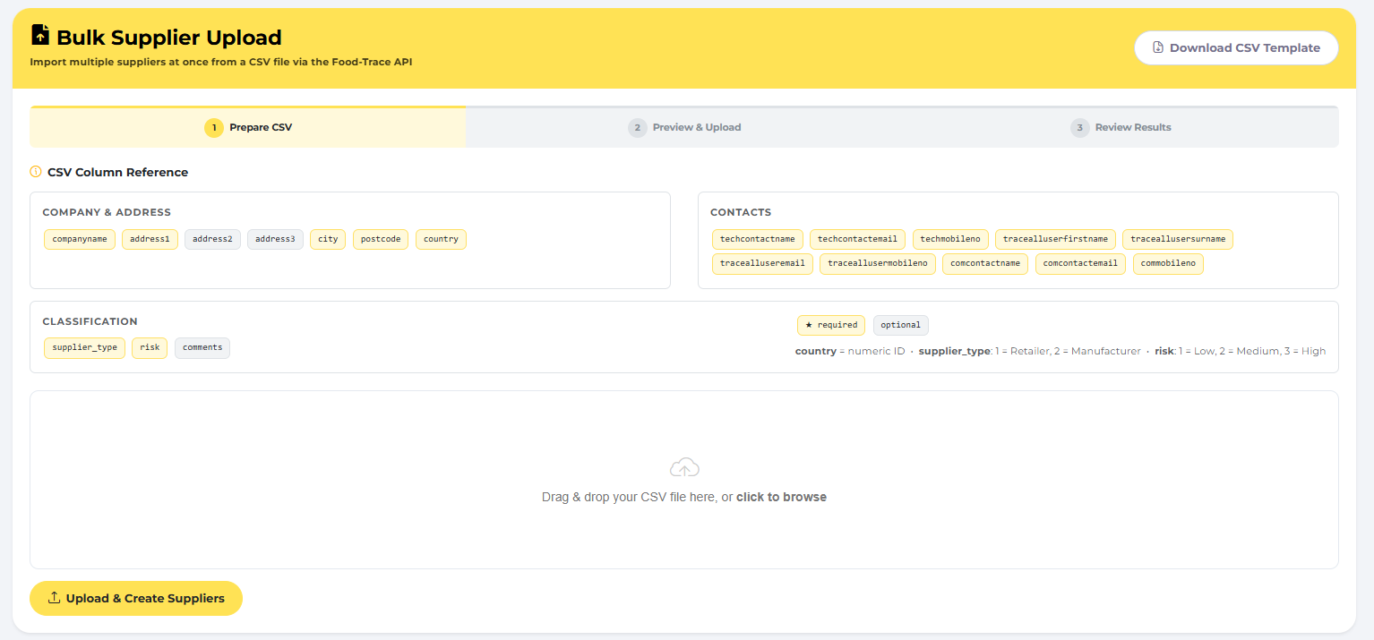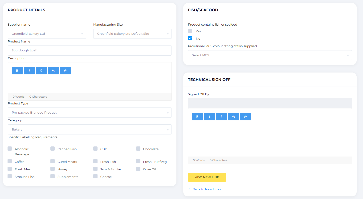 Food Trace manages the full NPD workflow from new line creation through to approved product specification with suppliers completing specs directly in the platform, your technical team reviewing and approving at every stage, and a complete audit trail retained throughout.
